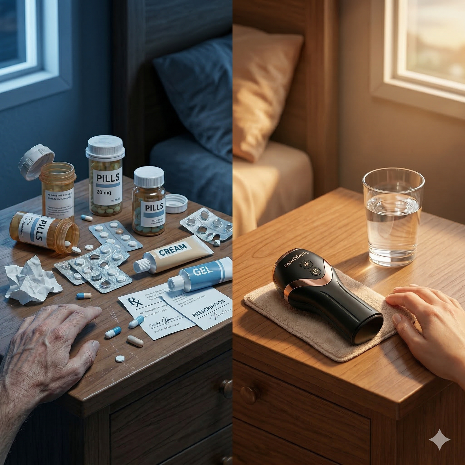 Pills force temporary blood flow but do nothing for ejaculation control or tissue health. UnderDrive Pro regenerates actual tissue, restores circulation permanently, AND trains ejaculatory control. It's a complete solution, not a temporary mask.